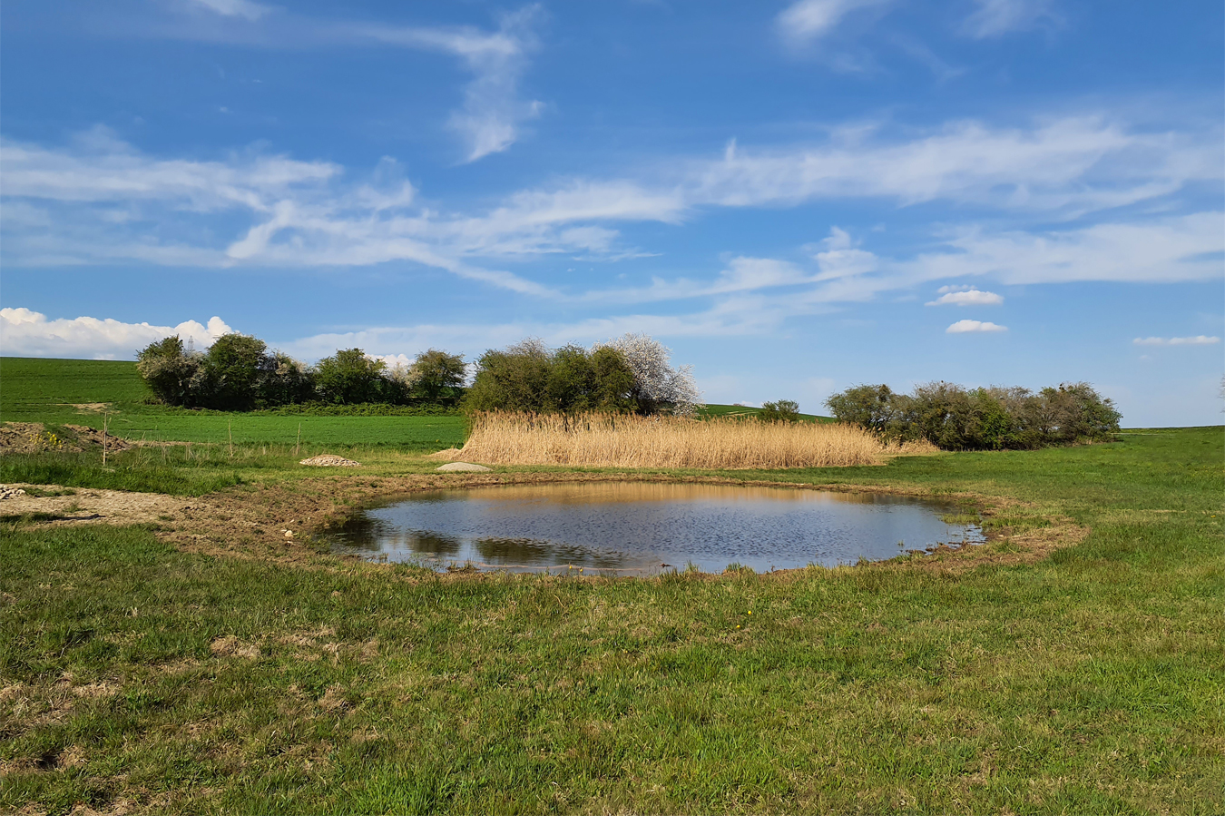 Le site du Bonbernard a été identifié comme particulièrement favorable à l’aménagement d’un habitat pour les amphibiens. Cette parcelle agricole, humide toute l’année, bénéficie d’un bon ensoleillement et se situe au carrefour de plusieurs sites déjà colonisés par des espèces rares. À l’automne 2024, nous avons piloté la création d’une prairie inondable, propice notamment à la reproduction de la rainette verte. Le milieu restera en eau jusqu’à la fin de l’été, avant de s’assécher naturellement et de pouvoir être exploité comme pré à litière par l’agriculteur. Plusieurs petites mares ont également été aménagées, ainsi que des structures annexes telles que des murgiers, des tas de bois et une haie d’une centaine de mètres de longueur.