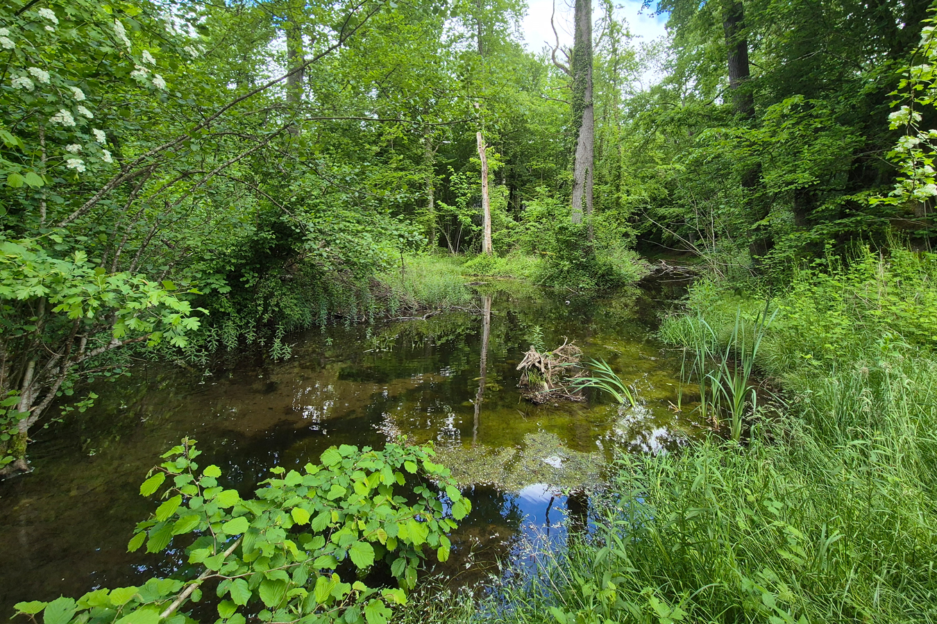 Les étangs des Chambrettes ont été aménagés à la fin des années 1990 dans un ancien bras du Boiron de Morges, lors de la rénovation du pont de l’autoroute A1. Une vingtaine d’années plus tard, ces plans d’eau, poursuivant leur évolution naturelle, commençaient à s’atterrir, menaçant leur fonction pour les espèces qu’ils abritent. Début 2024, nous avons piloté un chantier de curage afin de prolonger leur durée de vie. Des abattages ont été réalisés pour rajeunir le milieu et favoriser l’éclairage, tandis que de nouvelles mares ont été créées. Inventoriés comme sites de reproduction de batraciens d’importance régionale, ces étangs pourront ainsi accueillir ces espèces pendant de nombreuses années.